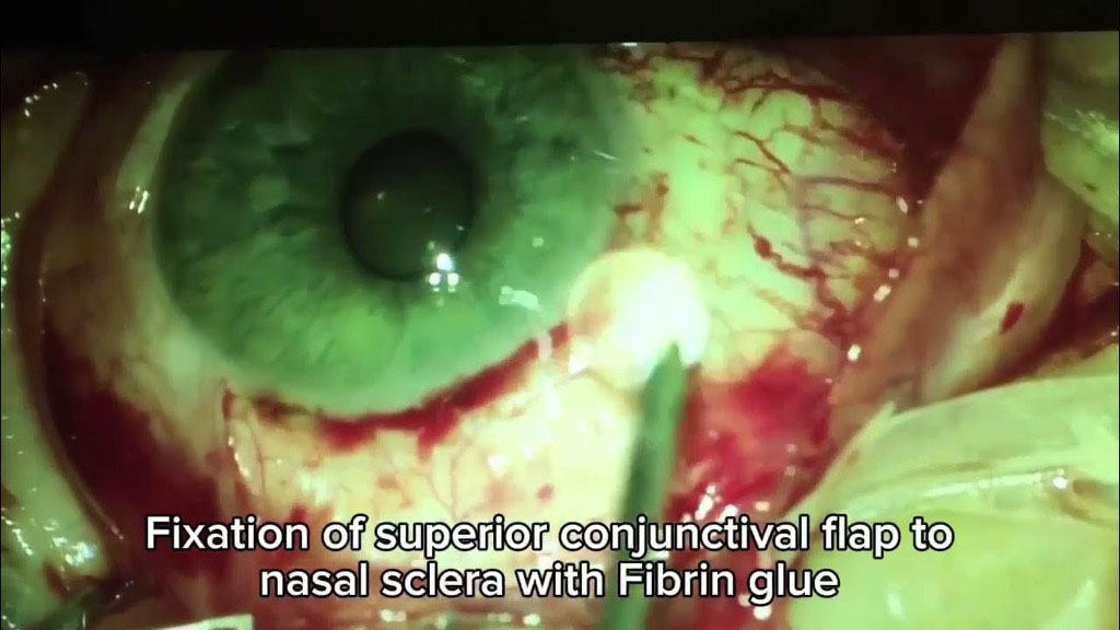 Figure 4A. Fixation of conjunctival flap to limbus and nasal sclera with Fibrin glue.