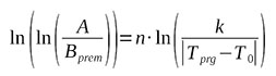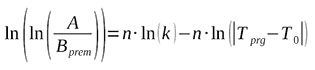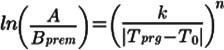 Using the "reference" expert values from Table 2, we find the coefficients k and n (1). For this purpose, we take the logarithm of the expression (1) by first dividing both parts by A and substituting the expression for t ̅,