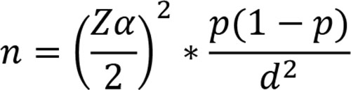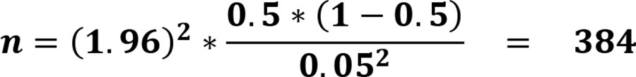 P (population proportion) = 50% Where n = required Sample size d= the margin error between the sample and the population = 0.05