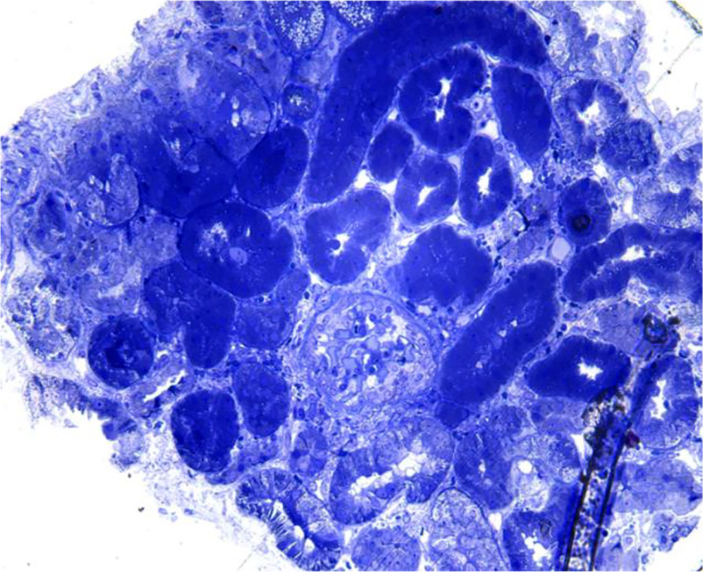 The patient's condition and blood tests did not improve although he received pulse corticotherapy IV, so, an explanation and treatment measures had to be found quickly. The only action that could bring additional information was a kidney biopsy, which was done (Fig. 1; Fig. 2, Fig. 3, Fig 4. and Fig. 5).
