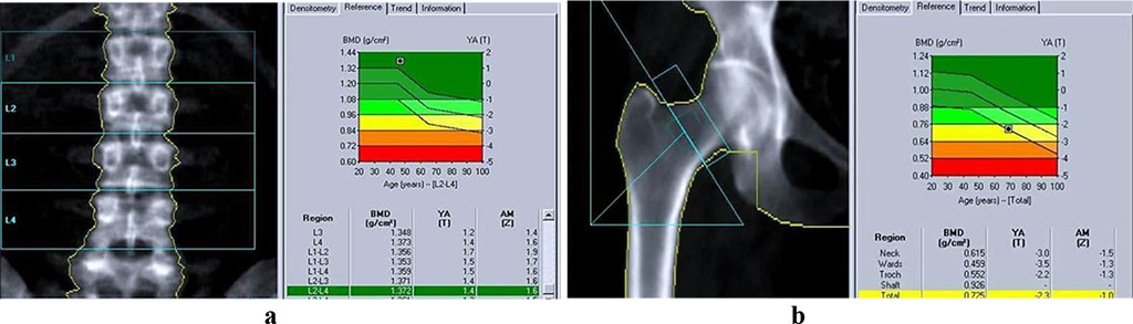 Figure 1. Bone tissue mineral density: a – lumbar spine; b – Warda triangle (GE Lunar Prodigy).