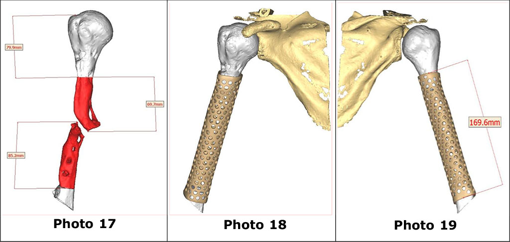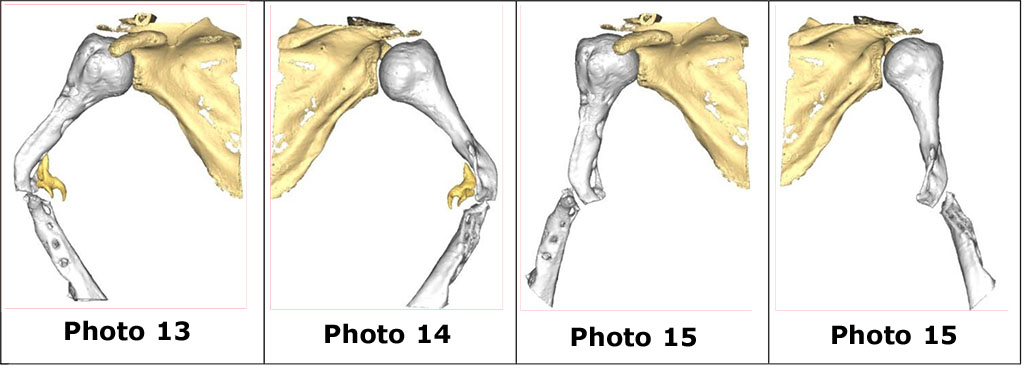 A clinical examination reveals a postoperative scar on the lateral surface of the right shoulder, compacted, hardened, without signs of inflammation. As in the first case, pre-operative planning was carried out in a Zoom conference in cooperation with the specialists of "Materialize Ukraine" using the SOFTWARE MATERIALIZE MIMICS INNOVATION SUITE. With the help of the software, a virtual image of the pathological segment (photos 13, 14) and digital repositioning of bone fragments of the humerus (photos 15 and 16) were performed.