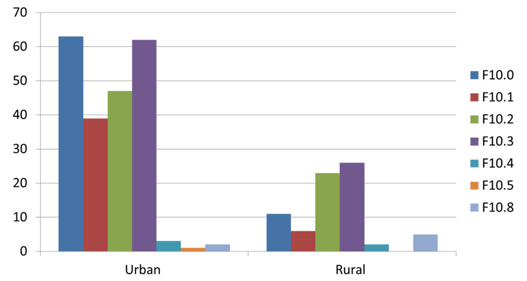 | Gender and residence | F10.0 | F10.1 | F10.2 | F10.3 | F10.4 | F10.5 | F10.8 |