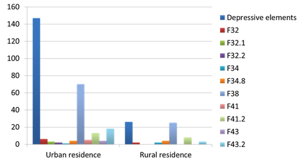 | Residence and gender | Depresive elements | F32 | F32.1 | F32.2 | F34 | F34.8 | F38 | F41 | F41.2 | F43 | F43.2 |